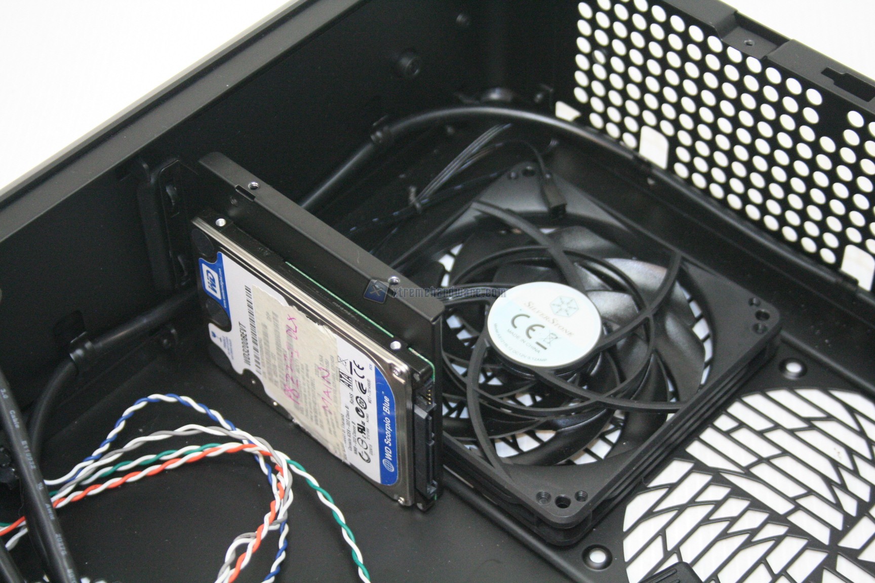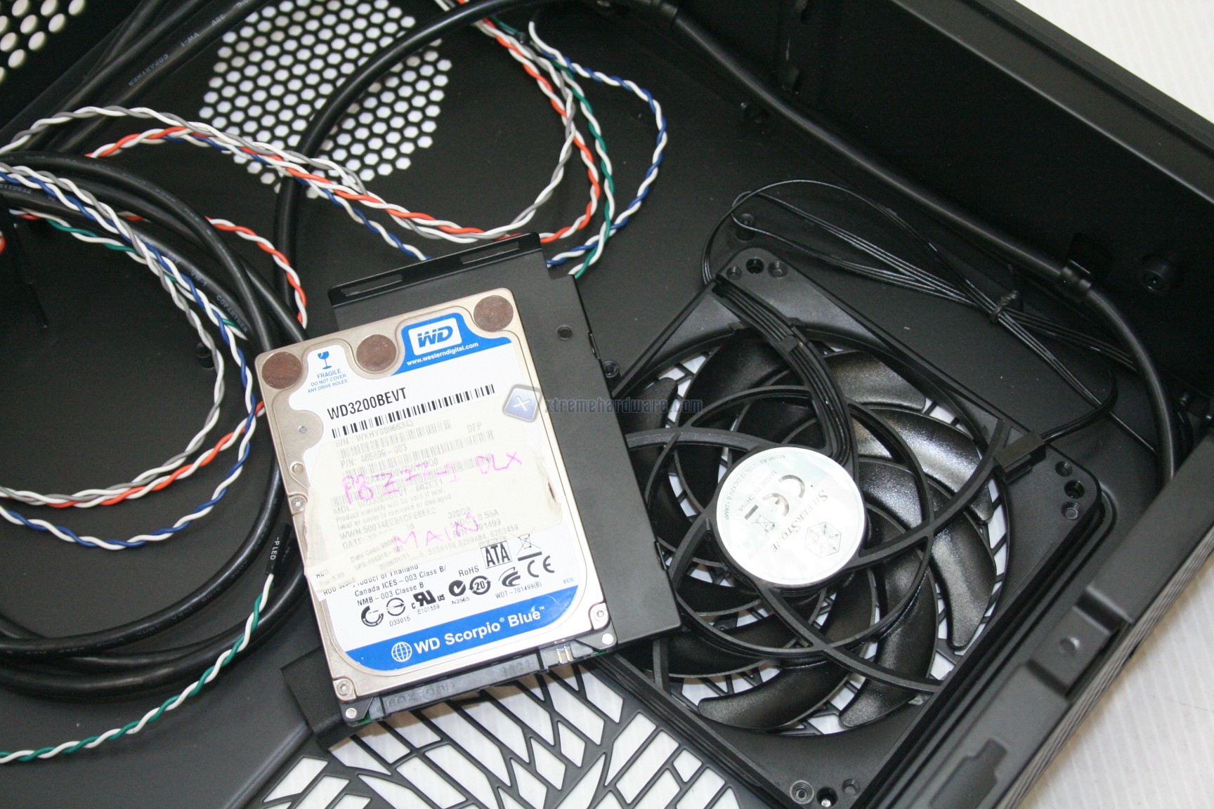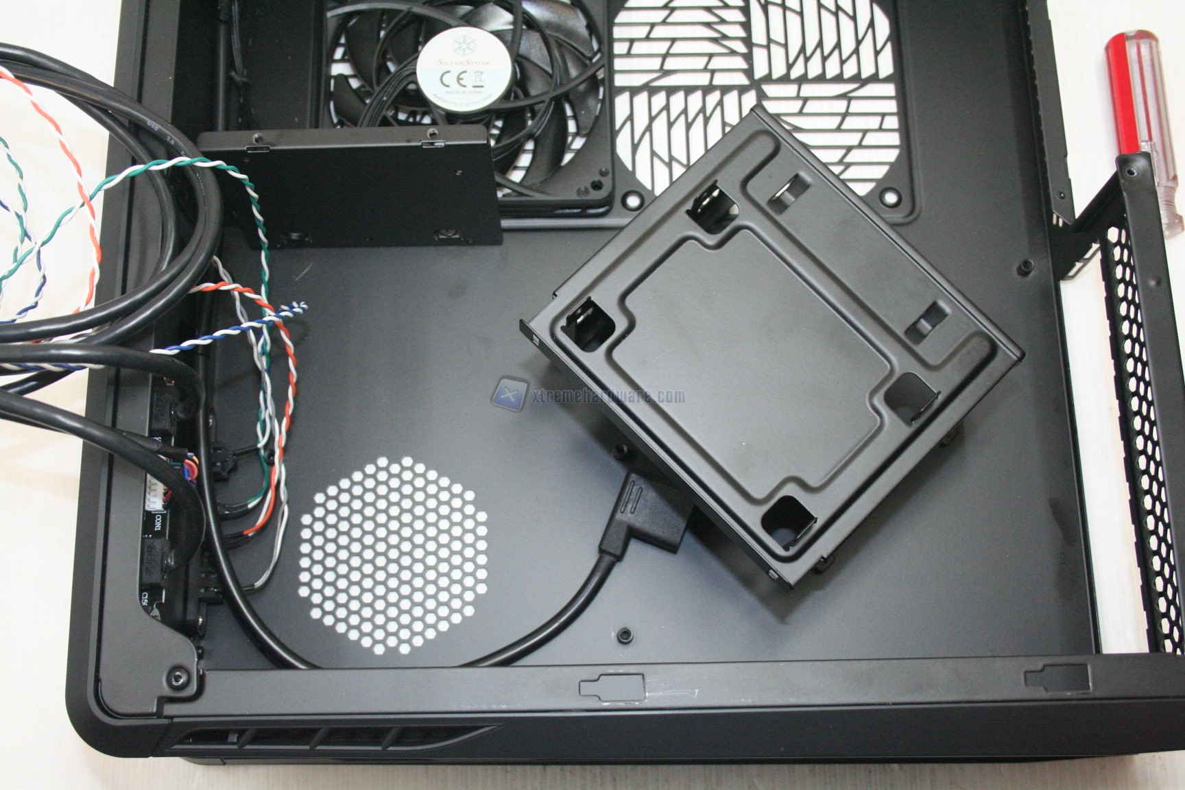 La gestione dei dischi rigidi, sebbene sia un cabinet Mini-ITX, è eccellente. Il disco da 3.5” deve essere inserito in un bay per hard disk posto sopra l’alimentatore, quindi si tratta di un sistema accoppiato. Il fissaggio avviene tramite viti. Oltre ai due slot da 2.5” posti dietro il PCB della VGA (distanziati, nessun problema di temperatura per chi se lo stesse chiedendo), ne è presente un terzo proprio dinanzi alla PSU, in una piccola paratia di acciaio verticale. È presente un sistema di blocco peculiare, ma nulla di difficoltoso. Ovviamente deve essere bloccato tramite la viteria però in questo caso il cablaggio dovrà essere effettuato quasi immediatamente, pena alcune problematiche di spostamento dei cavi.